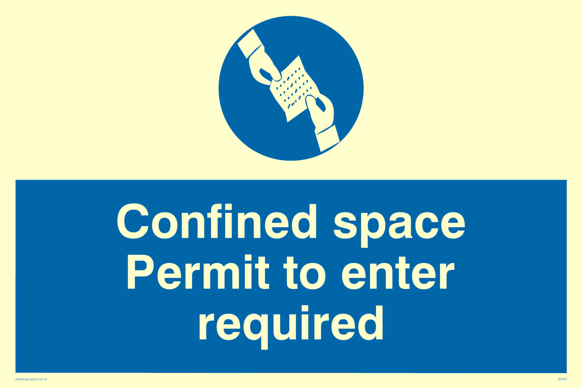 This sign contains a permit required symbol - permit / paper being passed from hand to hand in white within blue circle. Comes with a self adhesive backing.