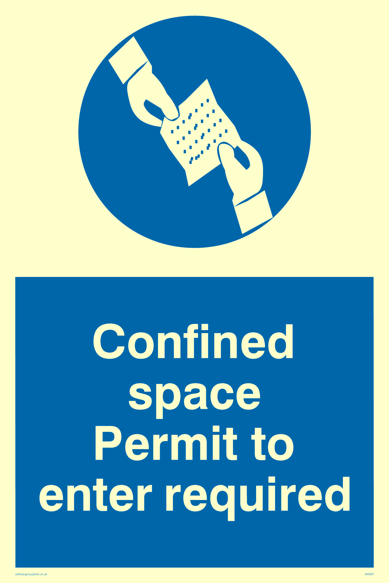 This sign contains a permit required symbol - permit / paper being passed from hand to hand in white within blue circle. Comes with a self adhesive backing.