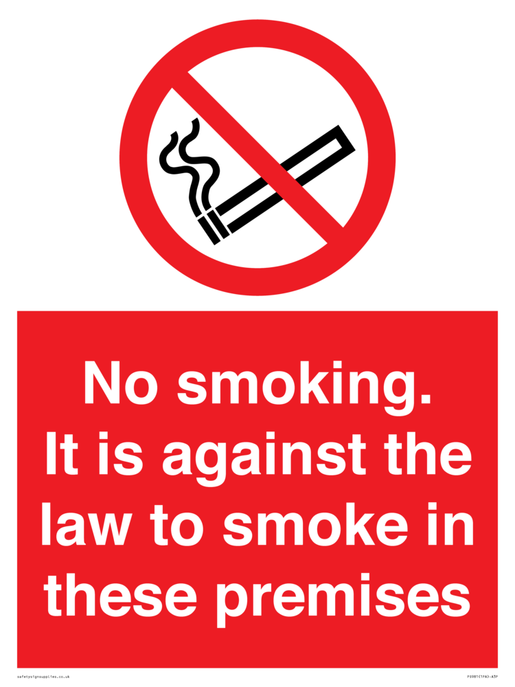 Sign Text: No smoking. It is against the law to smoke in these premises