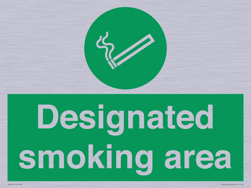 Sign Text: Designated smoking area Dimensions: 400x300mm Material: Brushed silver aluminum with 2 channel Orientation: Landscape Text Colour: White Background Colour: Green More...