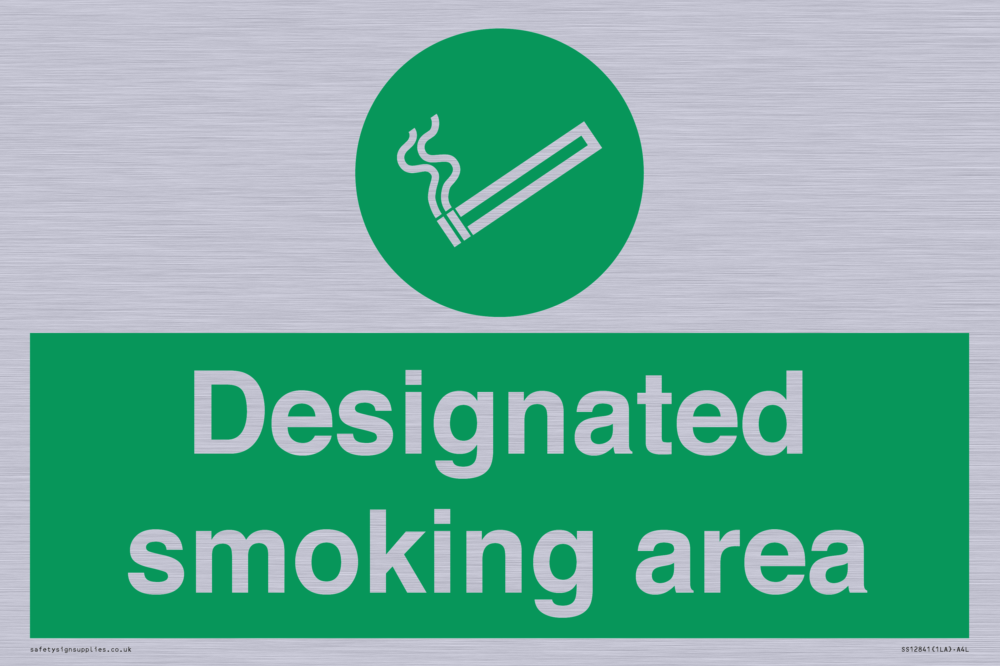 Sign Text: Designated smoking area Dimensions: 300x200mm Material: Brushed silver aluminum with 2 channel Orientation: Landscape Text Colour: White Background Colour: Green More...