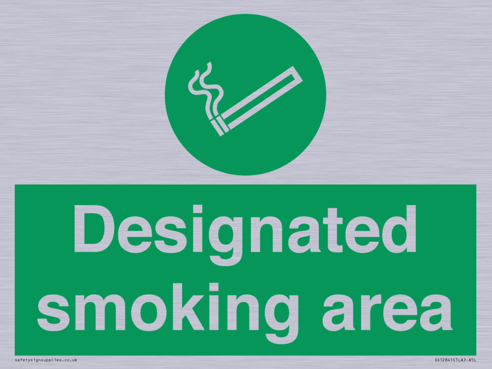 Sign Text: Designated smoking area Dimensions: 200x150mm Material: Brushed silver aluminum with 1 channel add X50CLIP1 to your basket for fixing Orientation: Landscape Text Colour: White Background Colour: Green More...