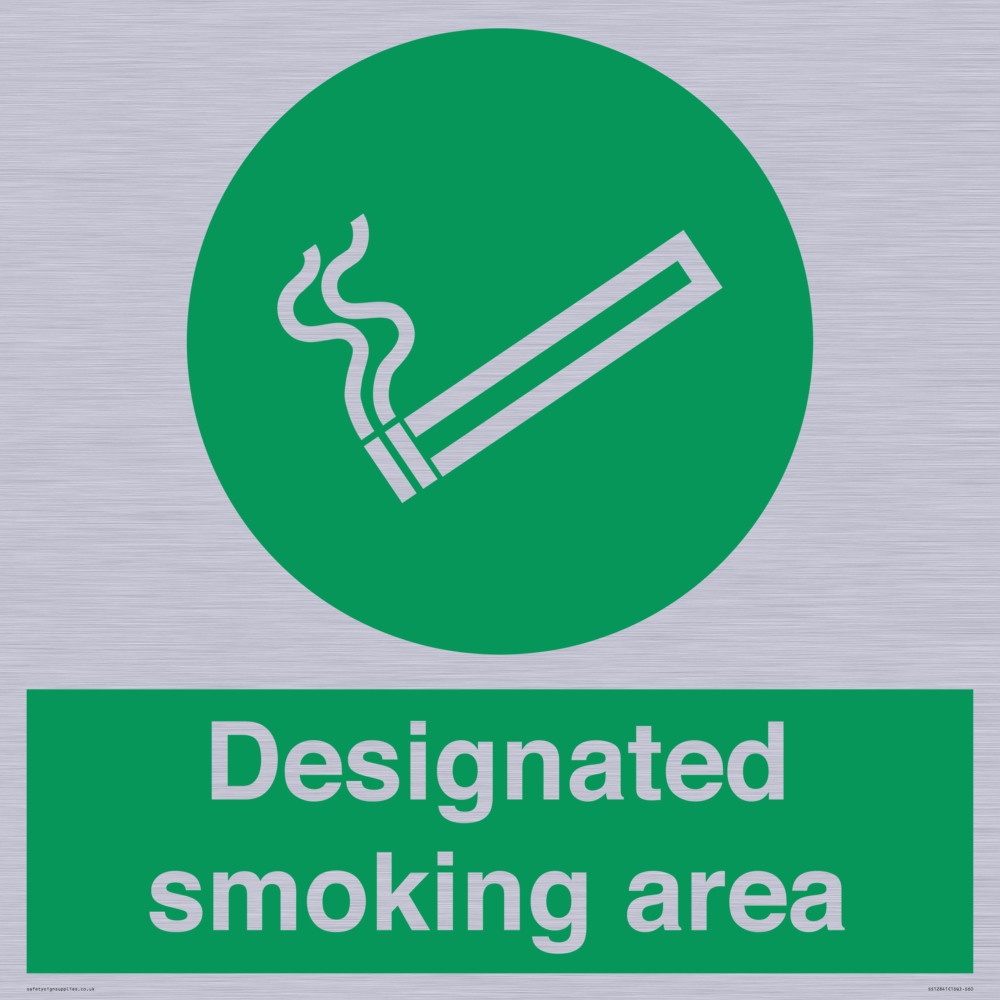 Sign Text: Designated smoking area Dimensions: 600x600mm Material: Brushed silver aluminum with 2 channel Orientation: Square Text Colour: White Background Colour: Green More...
