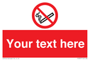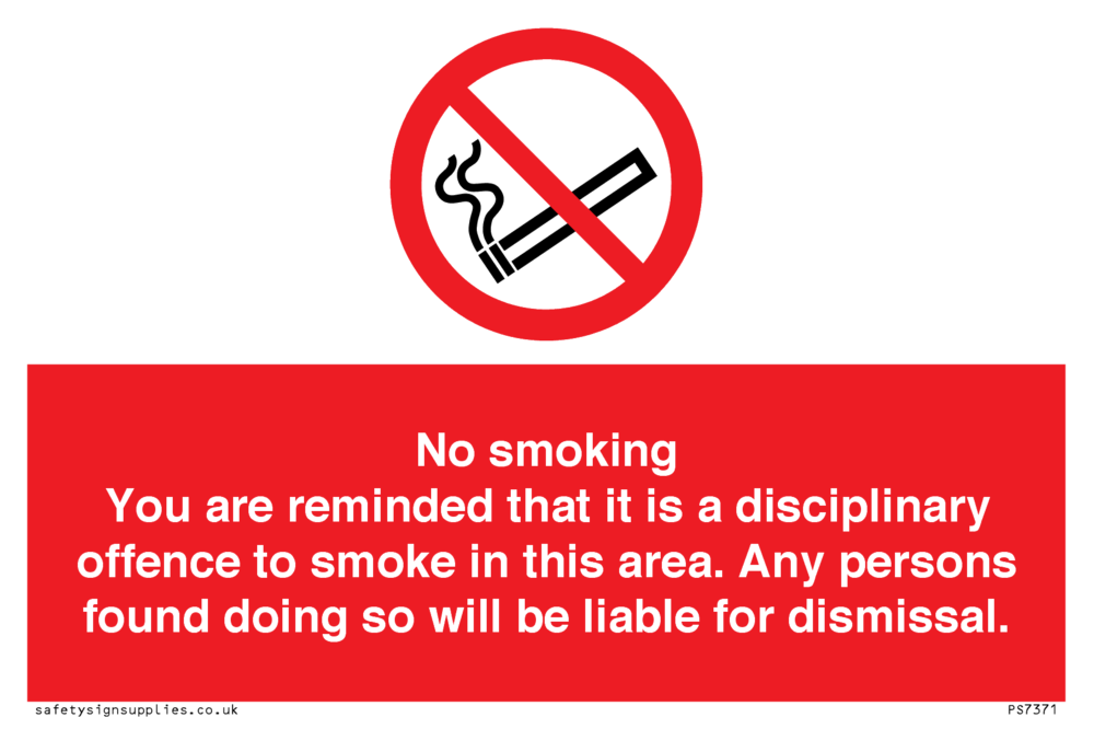 This sign contains a no smoking symbol - cigarette and smoke in black with red prohibition circle and line diagonally crossed through.
