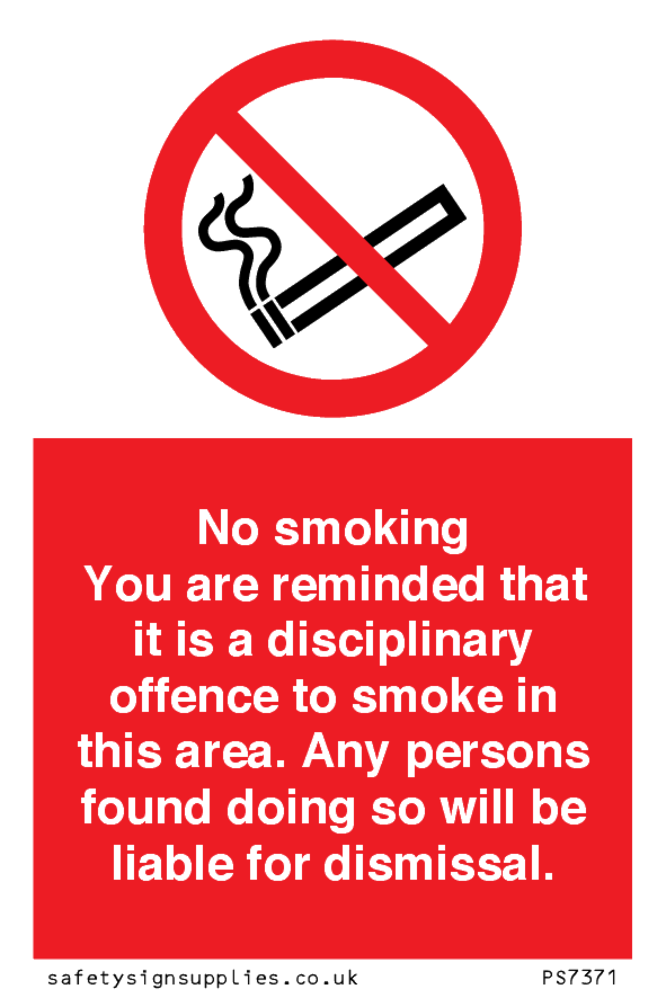 This sign contains a no smoking symbol - cigarette and smoke in black with red prohibition circle and line diagonally crossed through.