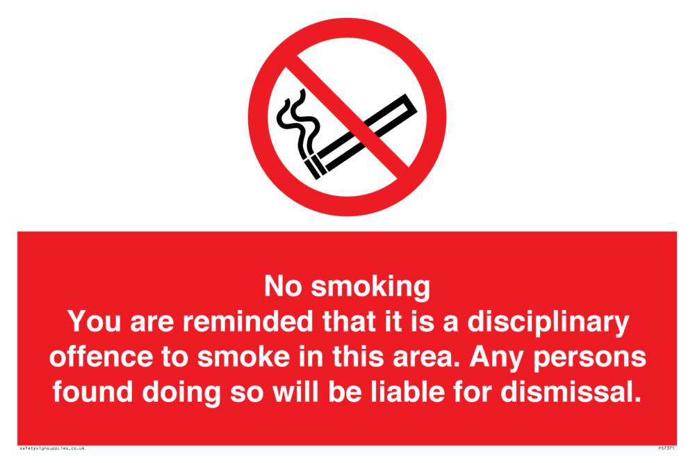 This sign contains a no smoking symbol - cigarette and smoke in black with red prohibition circle and line diagonally crossed through.