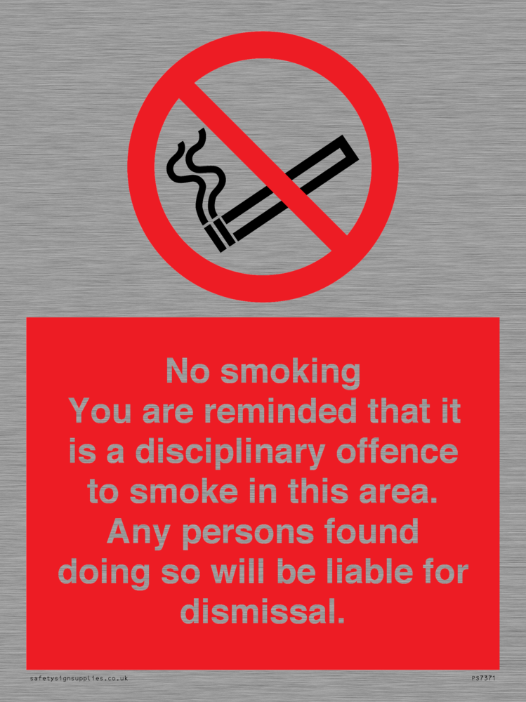 Sign Text: No smoking you are reminded that it is a disciplinary offence to smoke in this area. Any persons found doing so will be liable for dismissal.