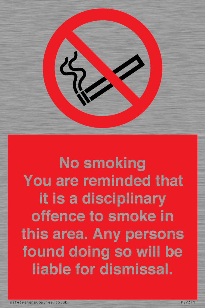 Sign Text: No smoking you are reminded that it is a disciplinary offence to smoke in this area. Any persons found doing so will be liable for dismissal.