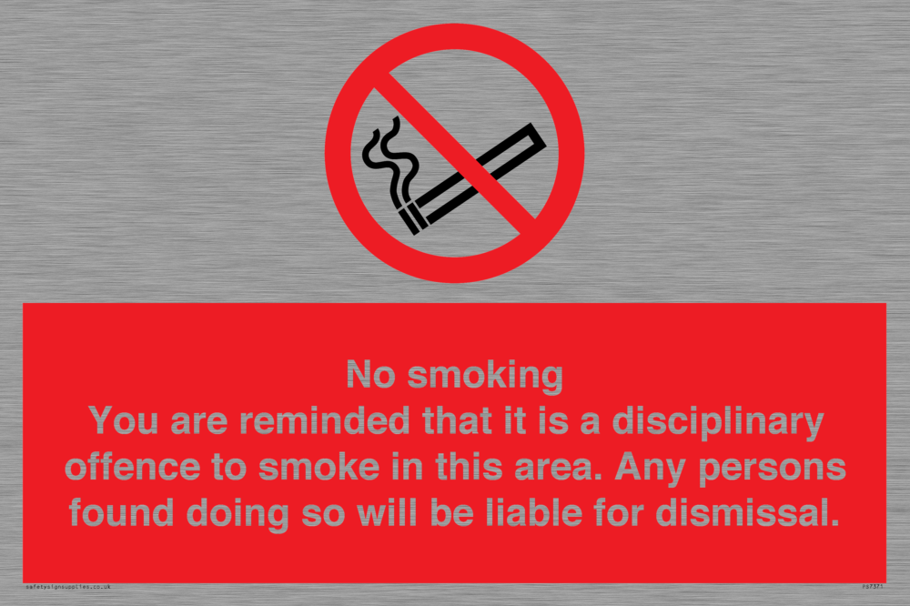 Sign Text: No smoking you are reminded that it is a disciplinary offence to smoke in this area. Any persons found doing so will be liable for dismissal.