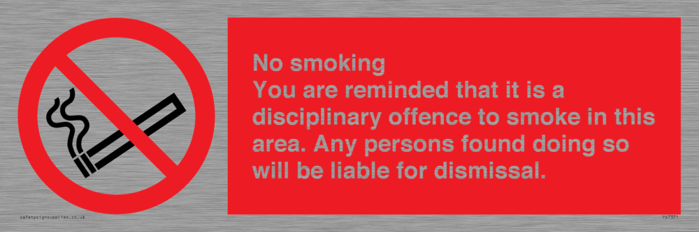 Sign Text: No smoking you are reminded that it is a disciplinary offence to smoke in this area. Any persons found doing so will be liable for dismissal.