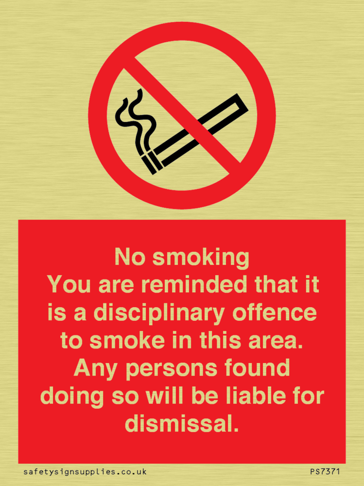 Sign Text: No smoking you are reminded that it is a disciplinary offence to smoke in this area. Any persons found doing so will be liable for dismissal.