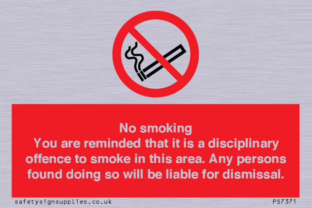 Sign Text: No smoking you are reminded that it is a disciplinary offence to smoke in this area. Any persons found doing so will be liable for dismissal.