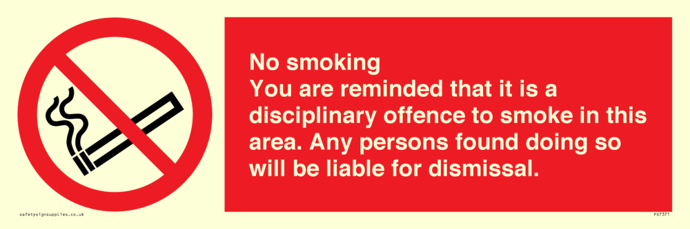Sign Text: No smoking you are reminded that it is a disciplinary offence to smoke in this area. Any persons found doing so will be liable for dismissal.