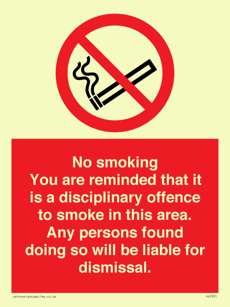 Sign Text: No smoking you are reminded that it is a disciplinary offence to smoke in this area. Any persons found doing so will be liable for dismissal.
