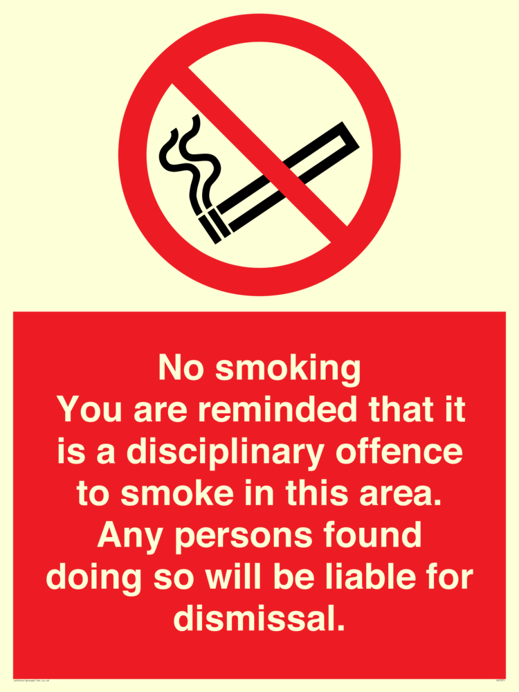 Sign Text: No smoking you are reminded that it is a disciplinary offence to smoke in this area. Any persons found doing so will be liable for dismissal.