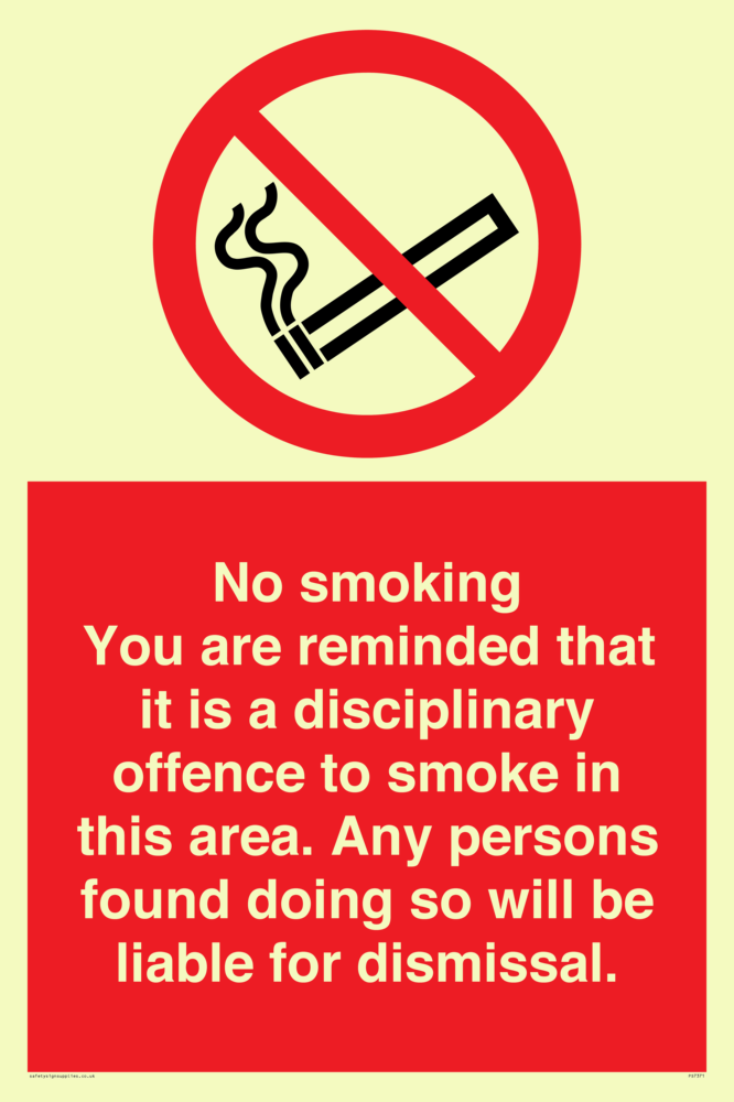 Sign Text: No smoking you are reminded that it is a disciplinary offence to smoke in this area. Any persons found doing so will be liable for dismissal.