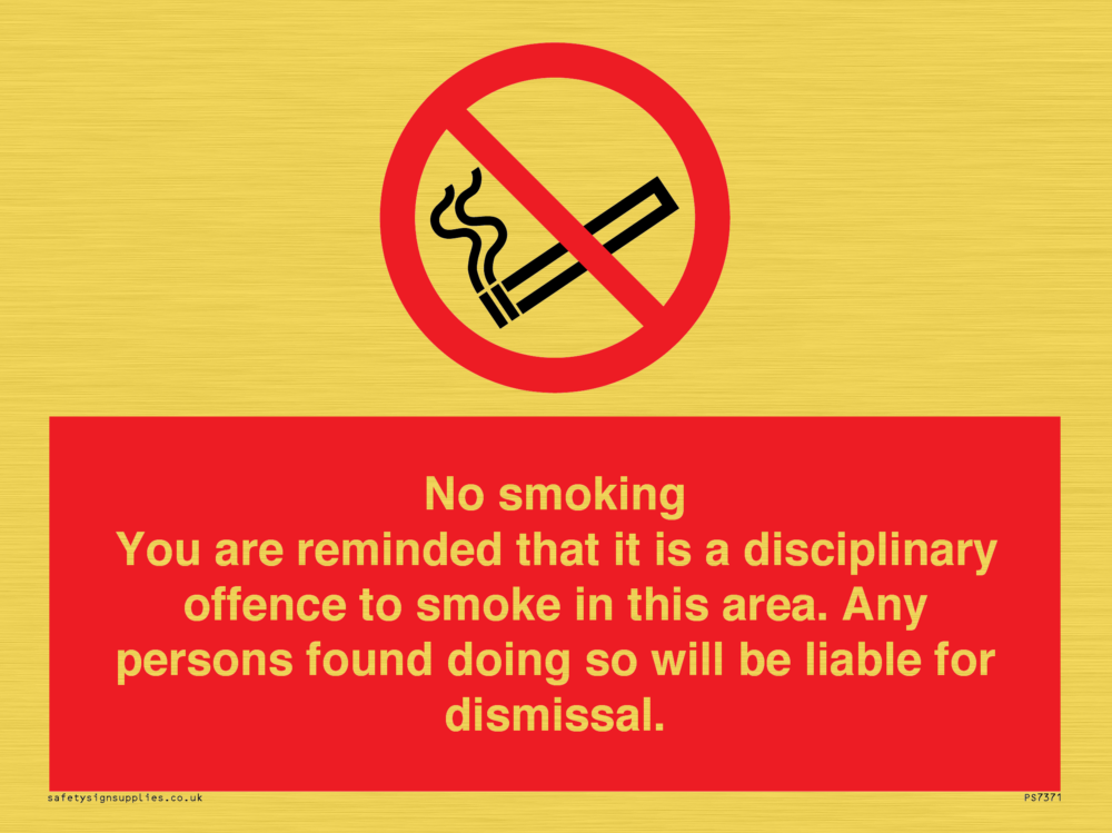 Sign Text: No smoking you are reminded that it is a disciplinary offence to smoke in this area. Any persons found doing so will be liable for dismissal.
