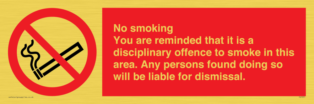 Sign Text: No smoking you are reminded that it is a disciplinary offence to smoke in this area. Any persons found doing so will be liable for dismissal.