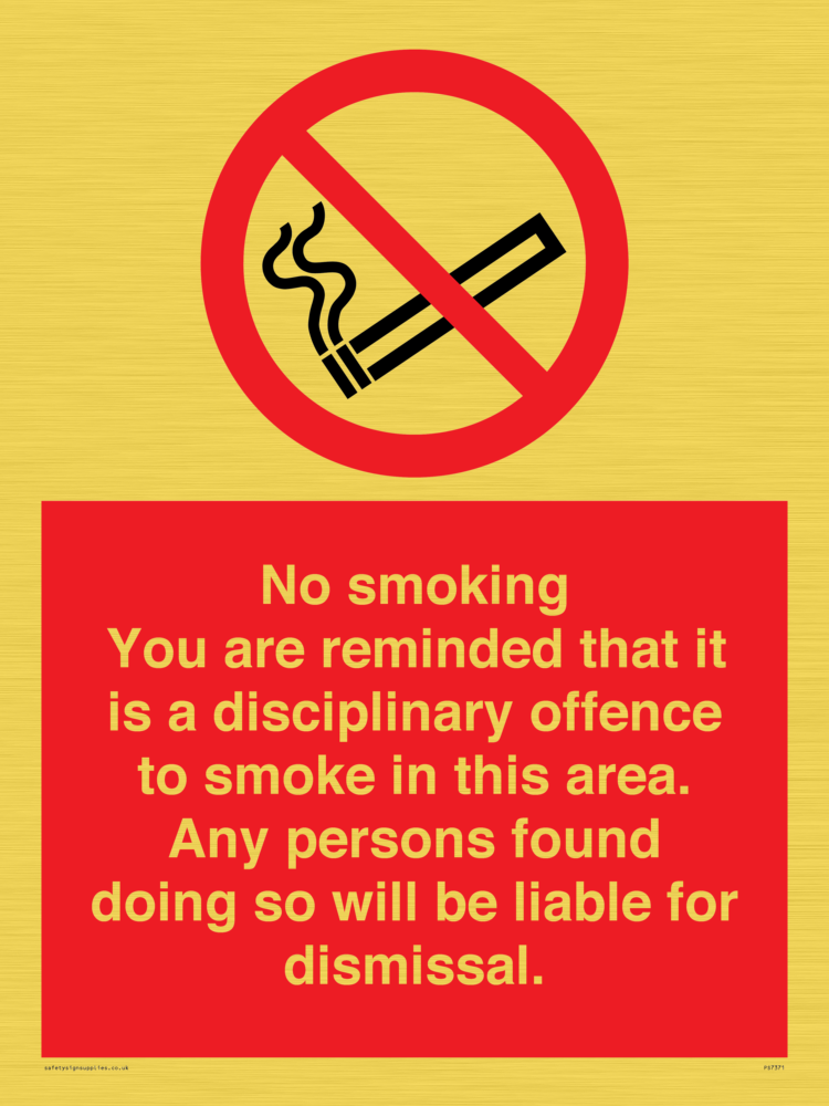 Sign Text: No smoking you are reminded that it is a disciplinary offence to smoke in this area. Any persons found doing so will be liable for dismissal.