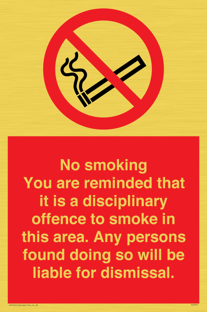 Sign Text: No smoking you are reminded that it is a disciplinary offence to smoke in this area. Any persons found doing so will be liable for dismissal.