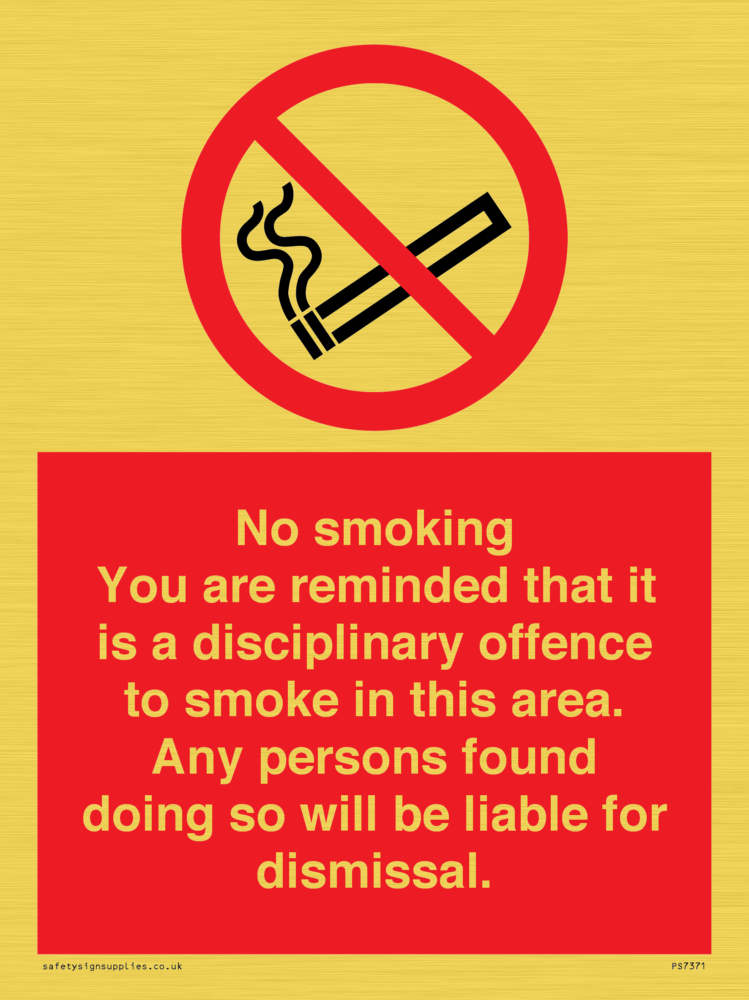 Sign Text: No smoking you are reminded that it is a disciplinary offence to smoke in this area. Any persons found doing so will be liable for dismissal.