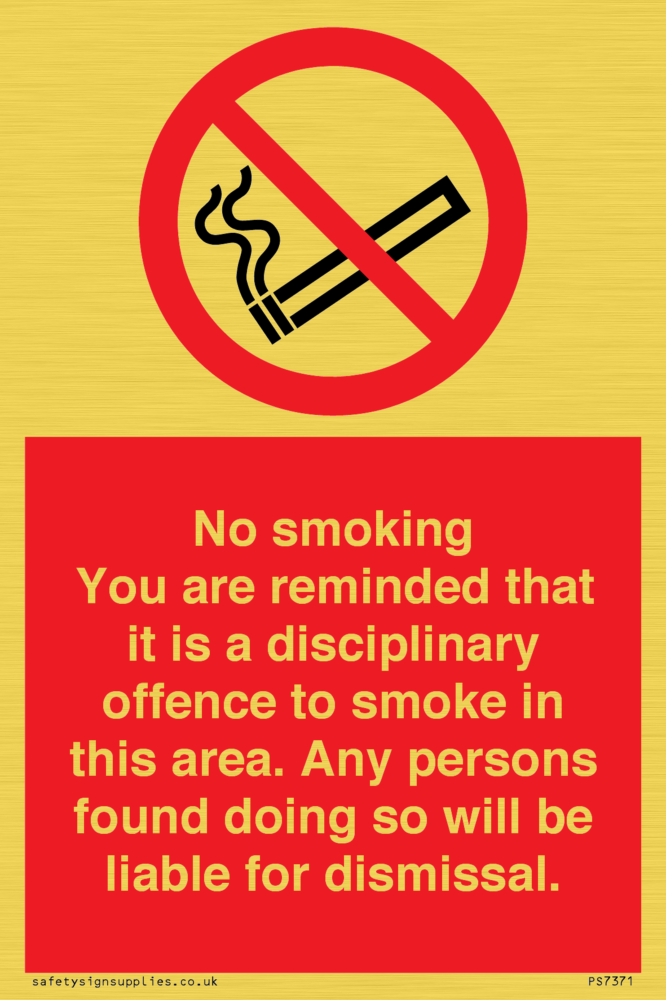 Sign Text: No smoking you are reminded that it is a disciplinary offence to smoke in this area. Any persons found doing so will be liable for dismissal.
