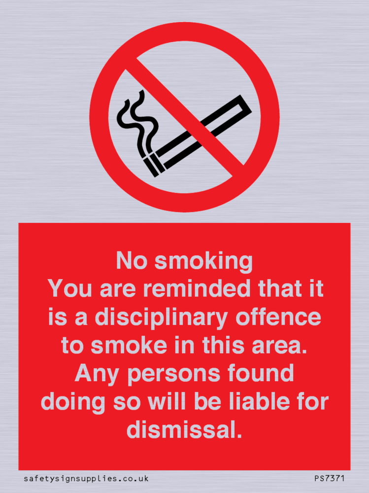 Sign Text: No smoking you are reminded that it is a disciplinary offence to smoke in this area. Any persons found doing so will be liable for dismissal.