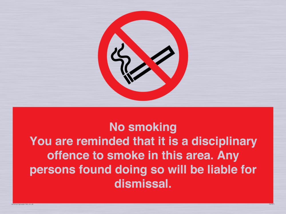 Sign Text: No smoking you are reminded that it is a disciplinary offence to smoke in this area. Any persons found doing so will be liable for dismissal.