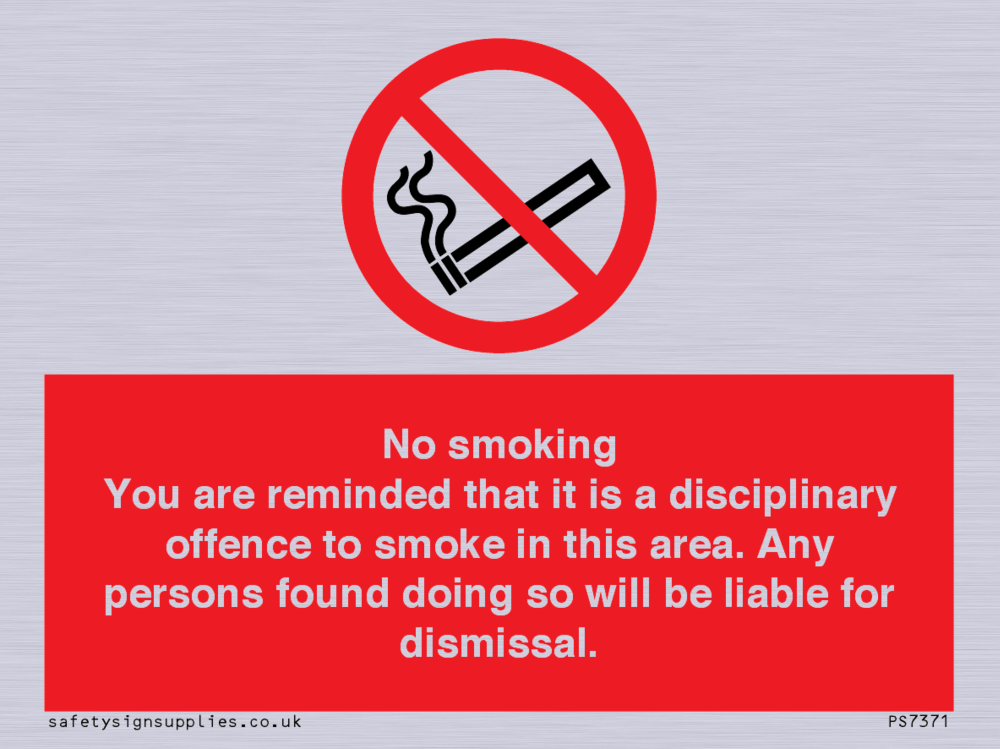 Sign Text: No smoking you are reminded that it is a disciplinary offence to smoke in this area. Any persons found doing so will be liable for dismissal.