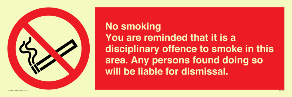 Sign Text: No smoking you are reminded that it is a disciplinary offence to smoke in this area. Any persons found doing so will be liable for dismissal.