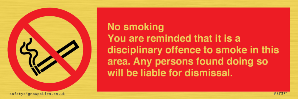 Sign Text: No smoking you are reminded that it is a disciplinary offence to smoke in this area. Any persons found doing so will be liable for dismissal.