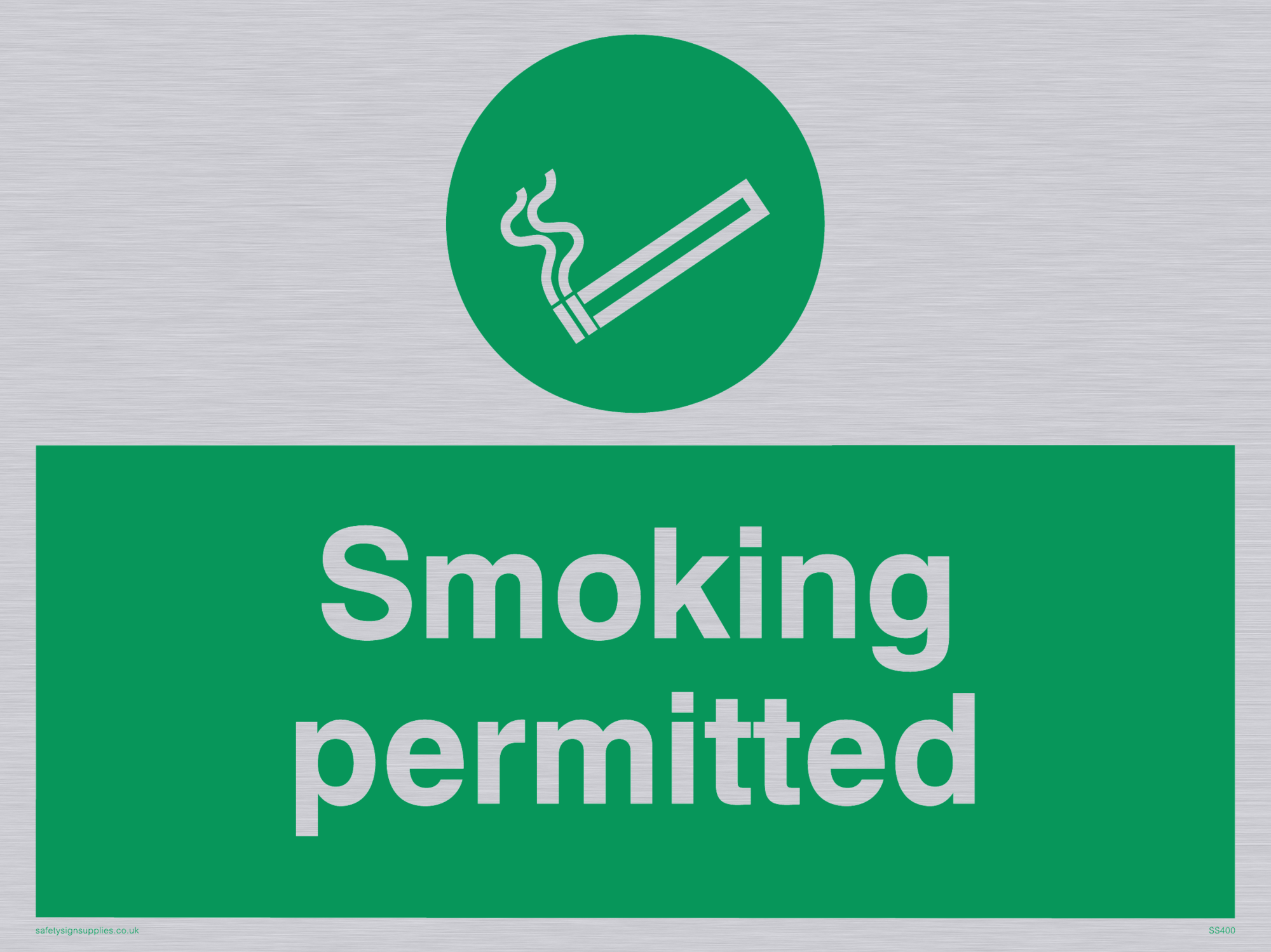 This sign contains a smoking permitted symbol - cigarette in white on green background.