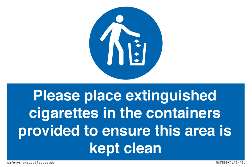 Sign Text: Please place extinguished cigarettes in the containers provided to ensure this area is kept clean