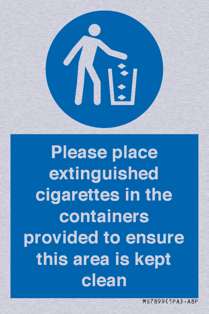Sign Text: Please place extinguished cigarettes in the containers provided to ensure this area is kept clean