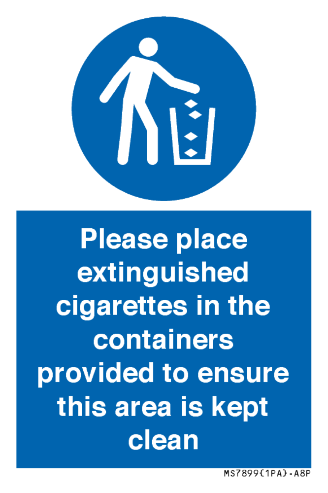 Sign Text: Please place extinguished cigarettes in the containers provided to ensure this area is kept clean