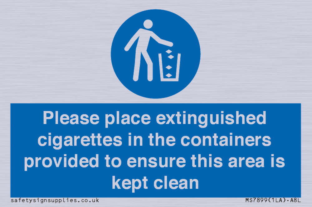 Sign Text: Please place extinguished cigarettes in the containers provided to ensure this area is kept clean