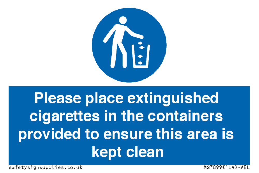Sign Text: Please place extinguished cigarettes in the containers provided to ensure this area is kept clean