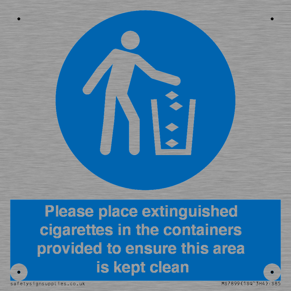 Sign Text: Please place extinguished cigarettes in the containers provided to ensure this area is kept clean