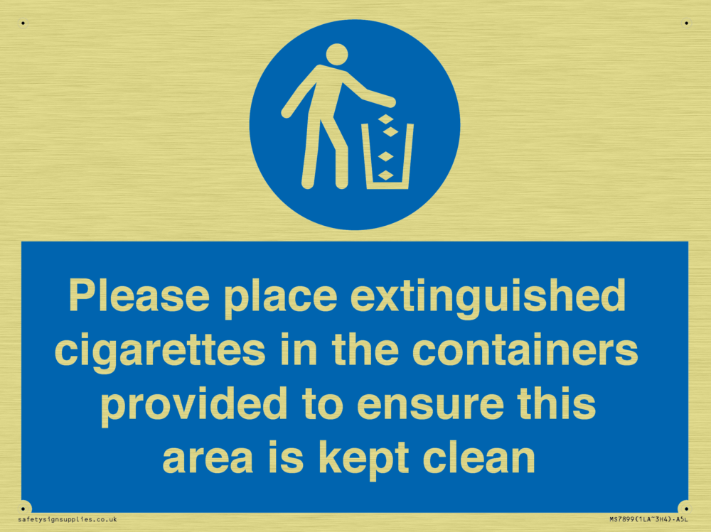 Sign Text: Please place extinguished cigarettes in the containers provided to ensure this area is kept clean