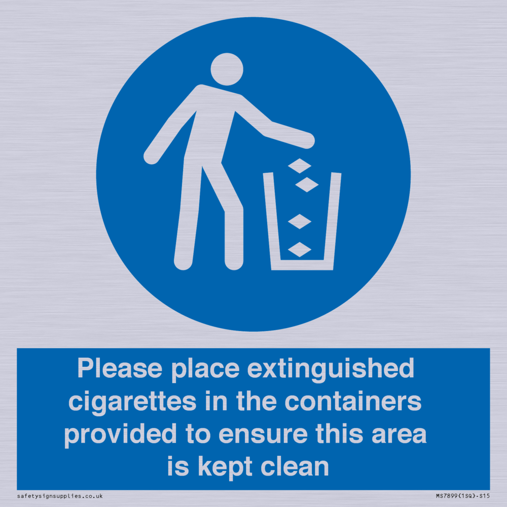 Sign Text: Please place extinguished cigarettes in the containers provided to ensure this area is kept clean