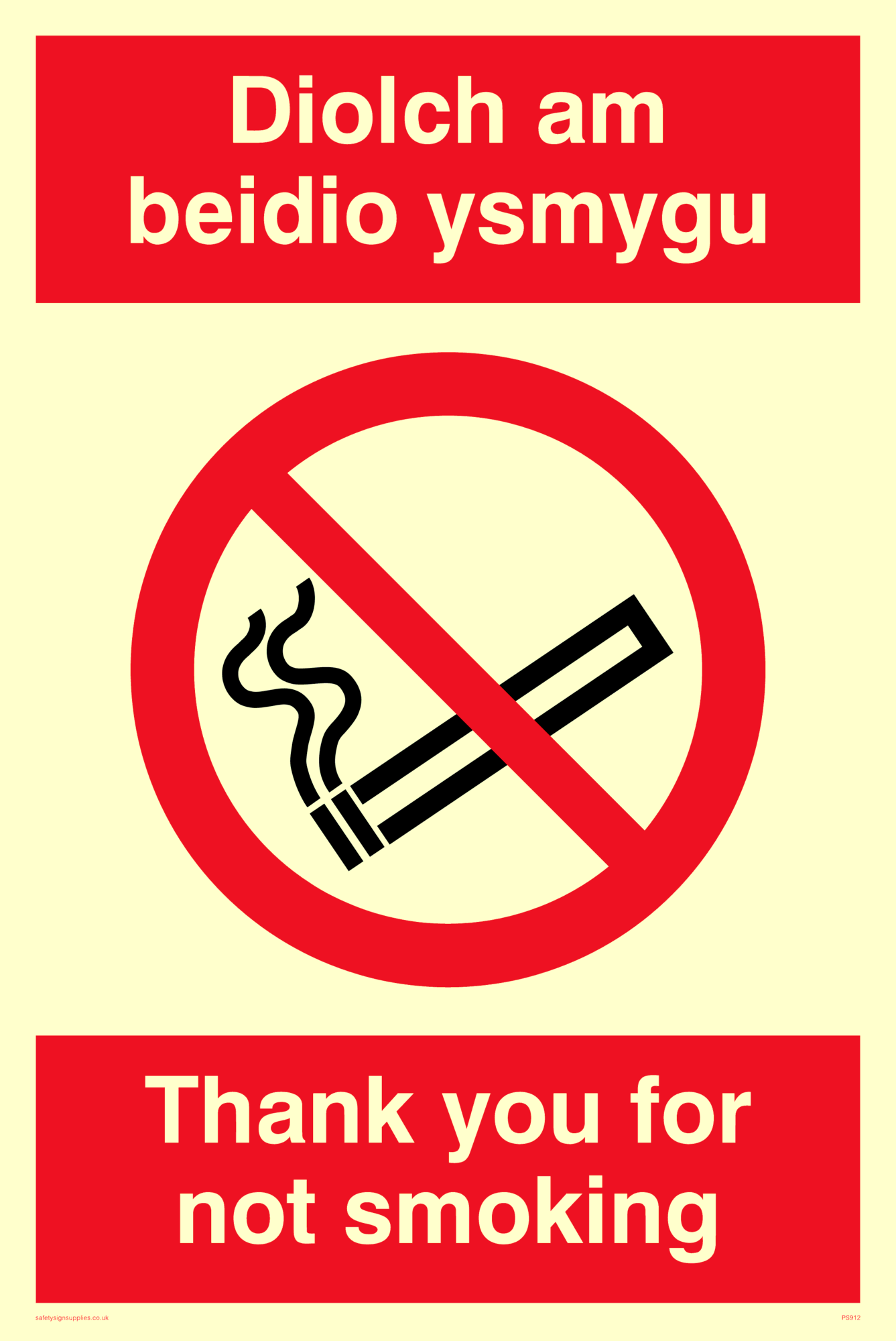 This sign contains a no smoking symbol - cigarette and smoke in black with red prohibition circle and line diagonally crossed through.