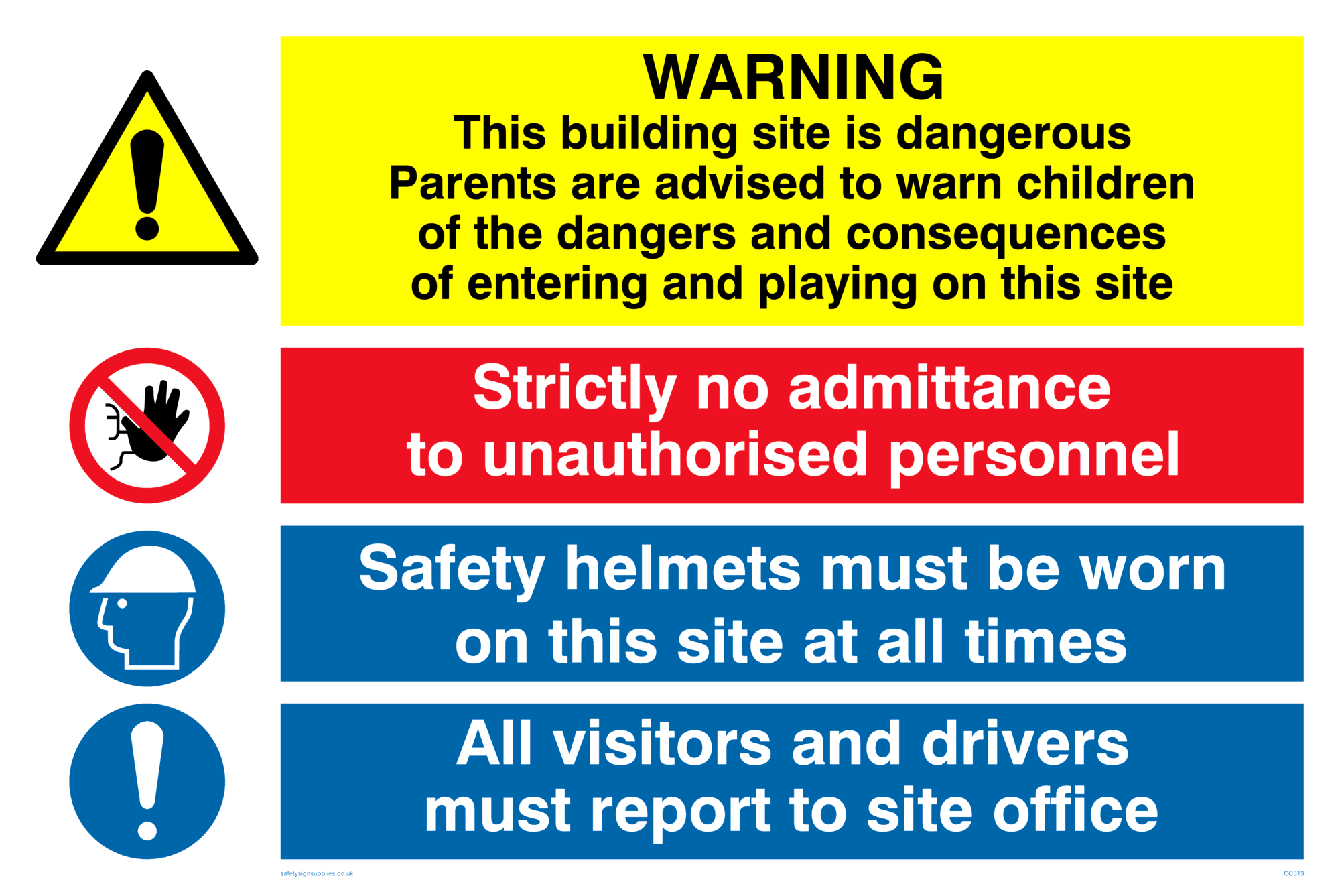 Construction Signs are used on building and construction sites to show safety policy requirements or hazards. BS5499 signs are designed to meet the applicable British Standard 5499, normally relating to fire exit signs. Site safety boards are used on construction sites and building sites, often at the entrance to combine many safety messages into one convinient sign.