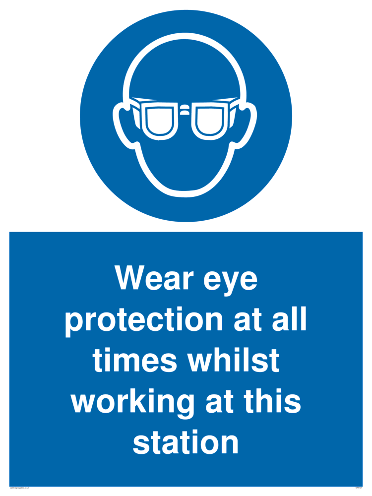 This sign contains an eye protection required symbol - person wearing safety glasses in white within blue circle.