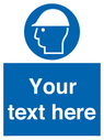 This sign contains a hard hat required symbol. Person wearing hard hat / head protection in white within blue circle.