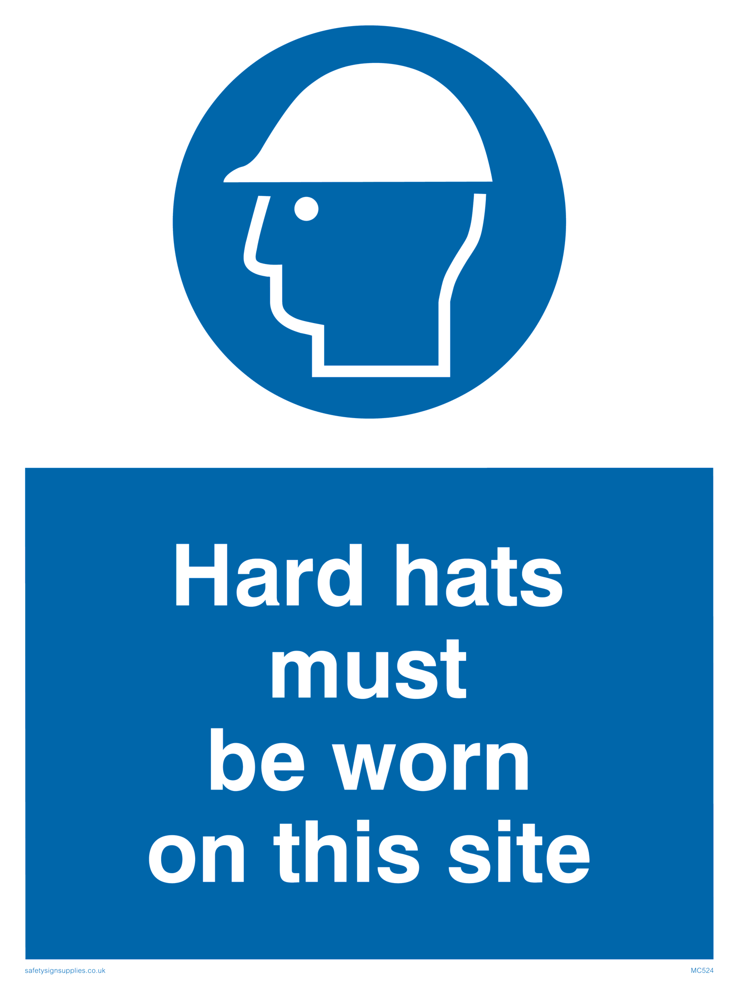 This sign contains a hard hat required symbol. Person wearing hard hat / head protection in white within blue circle.