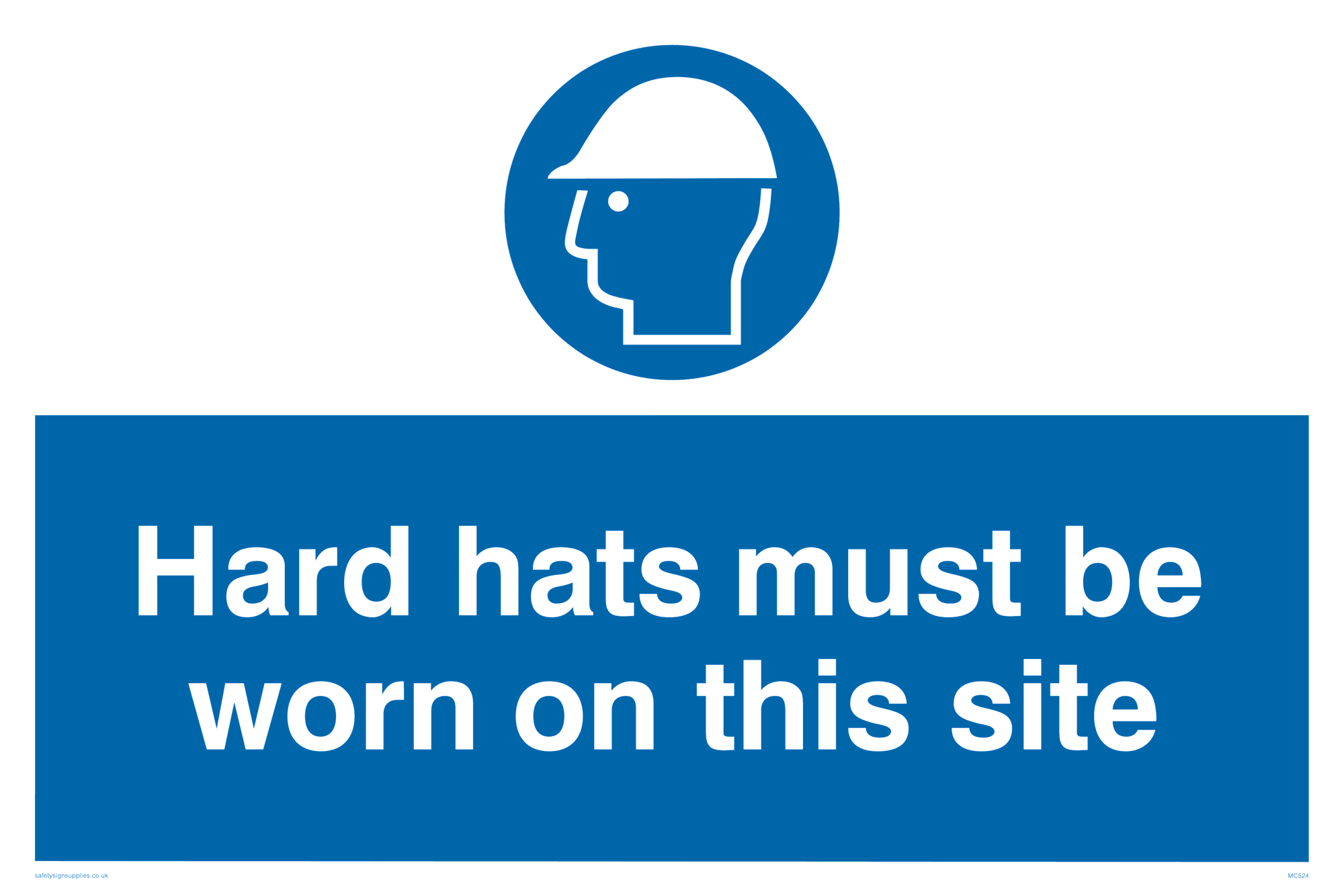 This sign contains a hard hat required symbol. Person wearing hard hat / head protection in white within blue circle.
