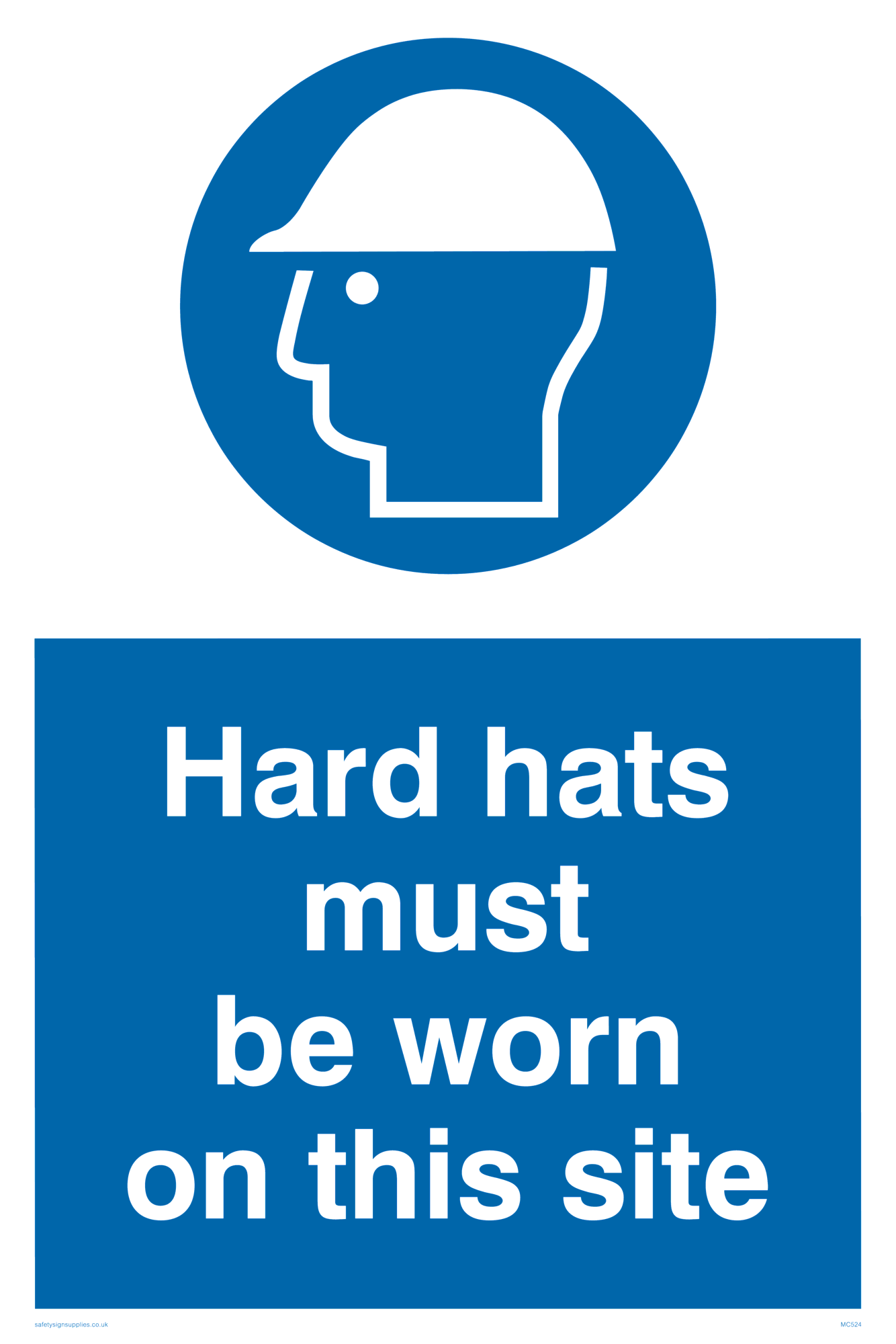 This sign contains a hard hat required symbol. Person wearing hard hat / head protection in white within blue circle.