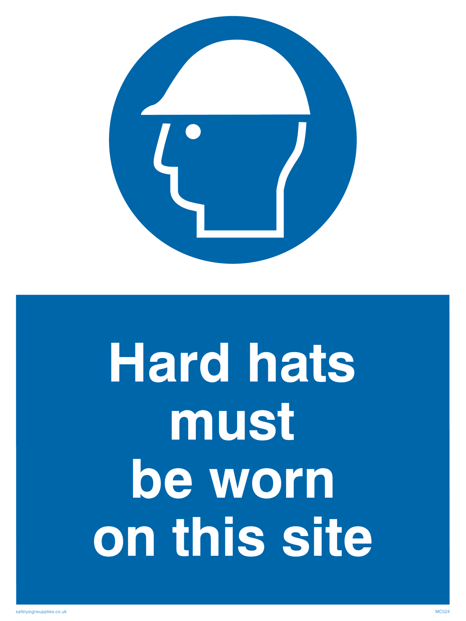 This sign contains a hard hat required symbol. Person wearing hard hat / head protection in white within blue circle. Comes with a self adhesive backing.