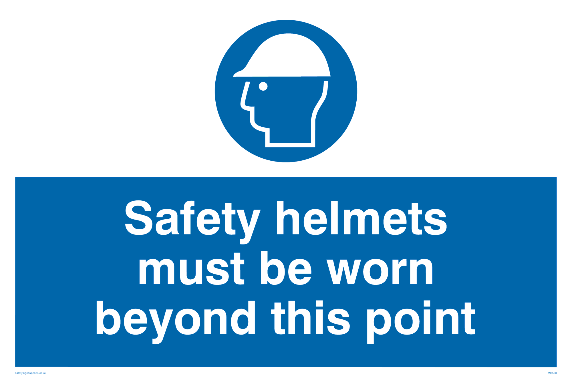 This sign contains a hard hat required symbol. Person wearing hard hat / head protection in white within blue circle.