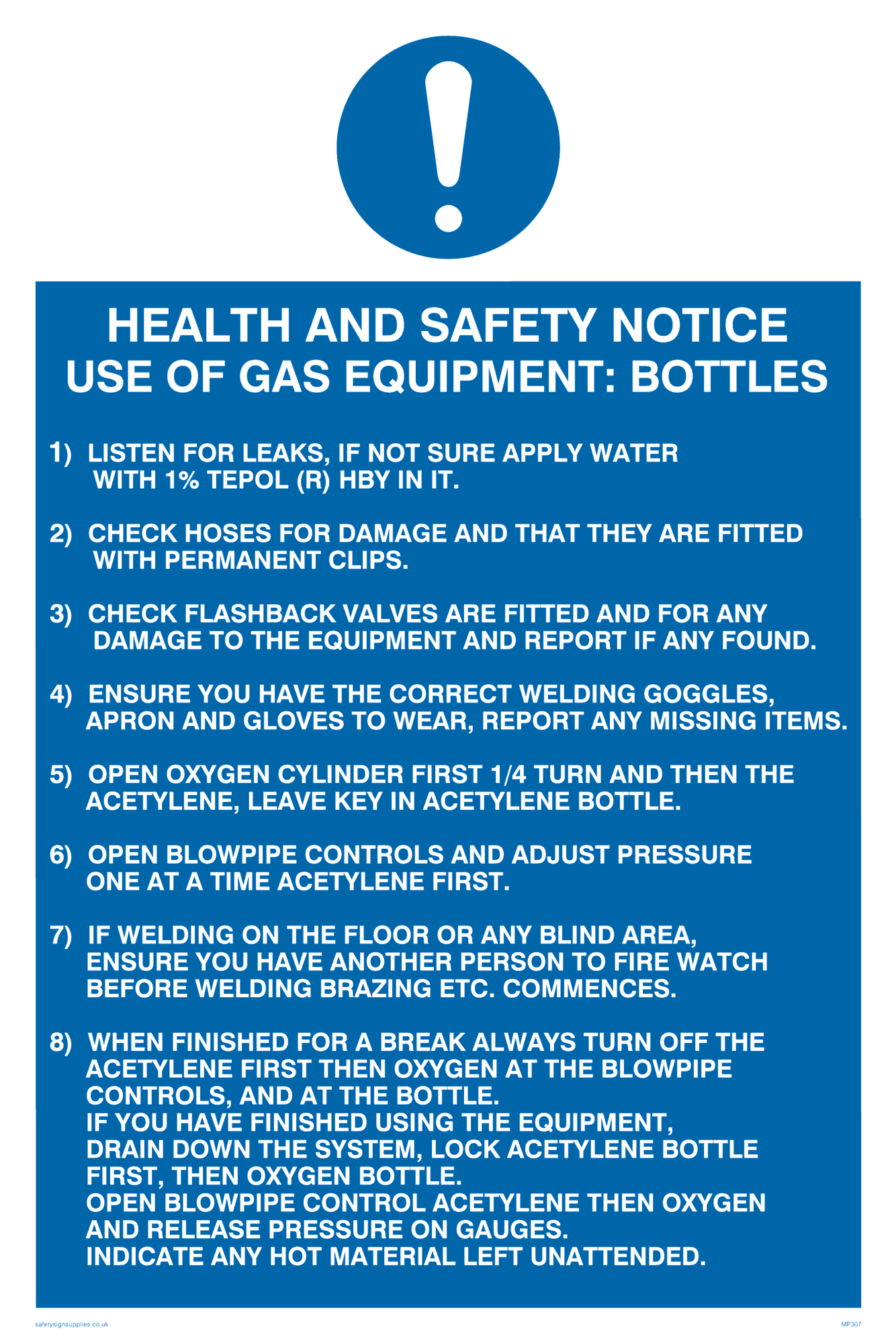 Sign Text: HEALTH AND SAFETY NOTICE USE OF GAS EQUIPMENT: BOTTLES 1) LISTEN FOR LEAKS IF NOT SURE APPLY WATER WITH 1% TEPOL (R) HBY IN IT. 2) CHECK HOSES FOR DAMAGE AND THAT THEY ARE FITTED WITH PERMANENT CLIPS. 3) CHECK FLASHBACK VALVES ARE FITTED AND FOR ANY DAMAGE TO THE EQUIPMENT AND REPORT IF ANY FOUND. 4) ENSURE YOU HAVE THE CORRECT WELDING GOGGLES, APRON AND GLOVES TO WEAR, REPORT ANY MISSING ITEMS. 5) OPEN OXYGEN CYLINDER FIRST 1/4 TURN AND THEN THE ACETYLENE, LEAVE KEY IN ACETYLENE BOTTLE. 6) OPEN BLOWPIPE CONTROLS AND ADJUST PRESSURE ONE AT A TIME ACETYLENE FIRST. 7) IF WELDING ON THE FLOOR OR ANY BLIND AREA, ENSURE YOU HAVE ANOTHER PERSON TO FIRE WATCH BEFORE WELDING BRAZING ETC. COMMENCES. 8) ONLY USE STEEL ON ABRASIVE WHEELS NOT SUITABLE FOR ALUMINIUM, BRASS, COPPER, SOFT MATERIALS, WOOD, ETC. 9) ALLOW WHEEL TO SLOW DOWN NATURALLY DO NOT STOP IT. 10) WHEN FINISHED FOR A BREAK ALWAYS TURN OFF THE ACETYLENE FIRST THEN OXYGEN AT THE BLOWPIPE CONTROLS, AND AT THE BOTTLE. IF YOU HAVE FI